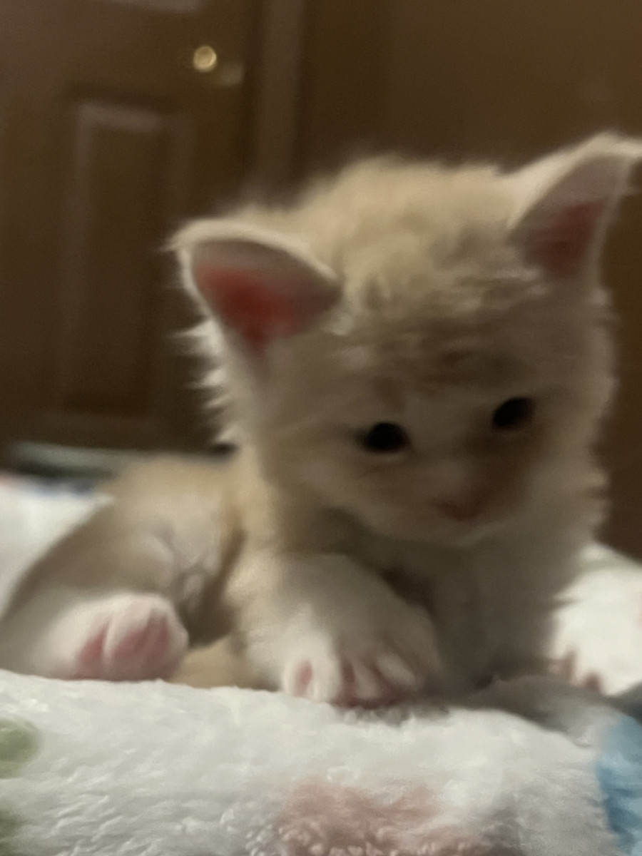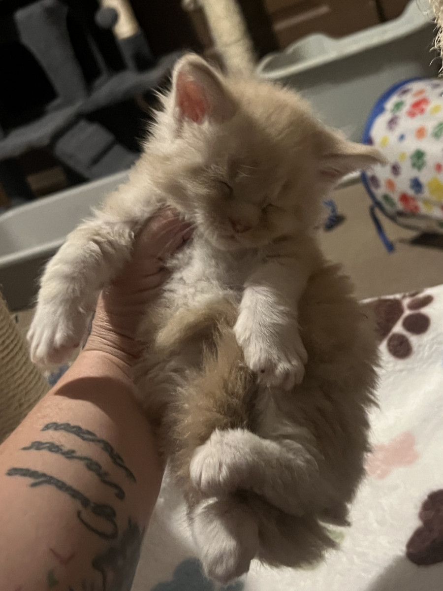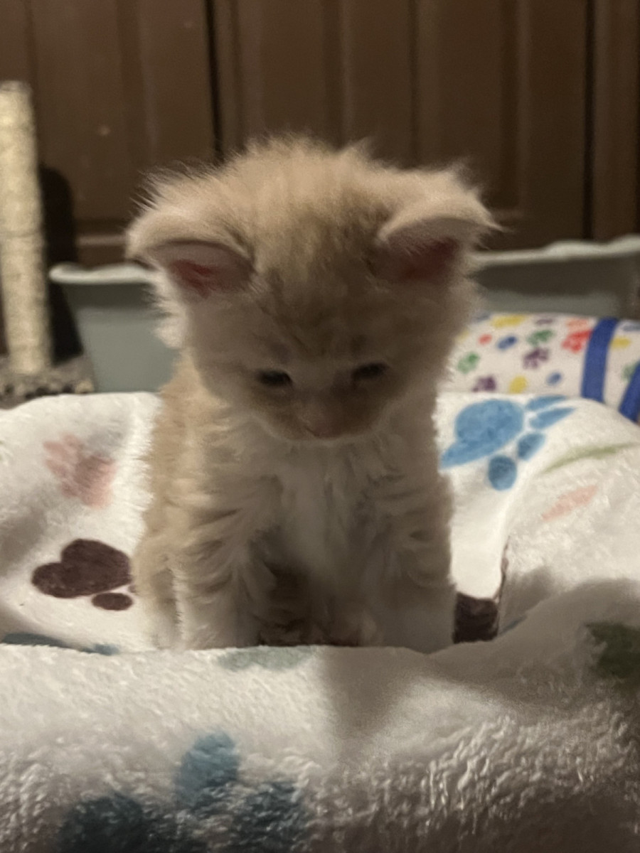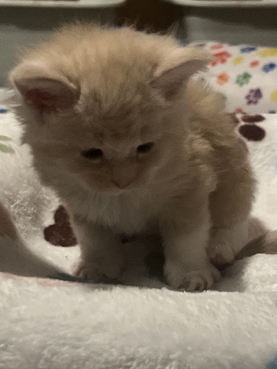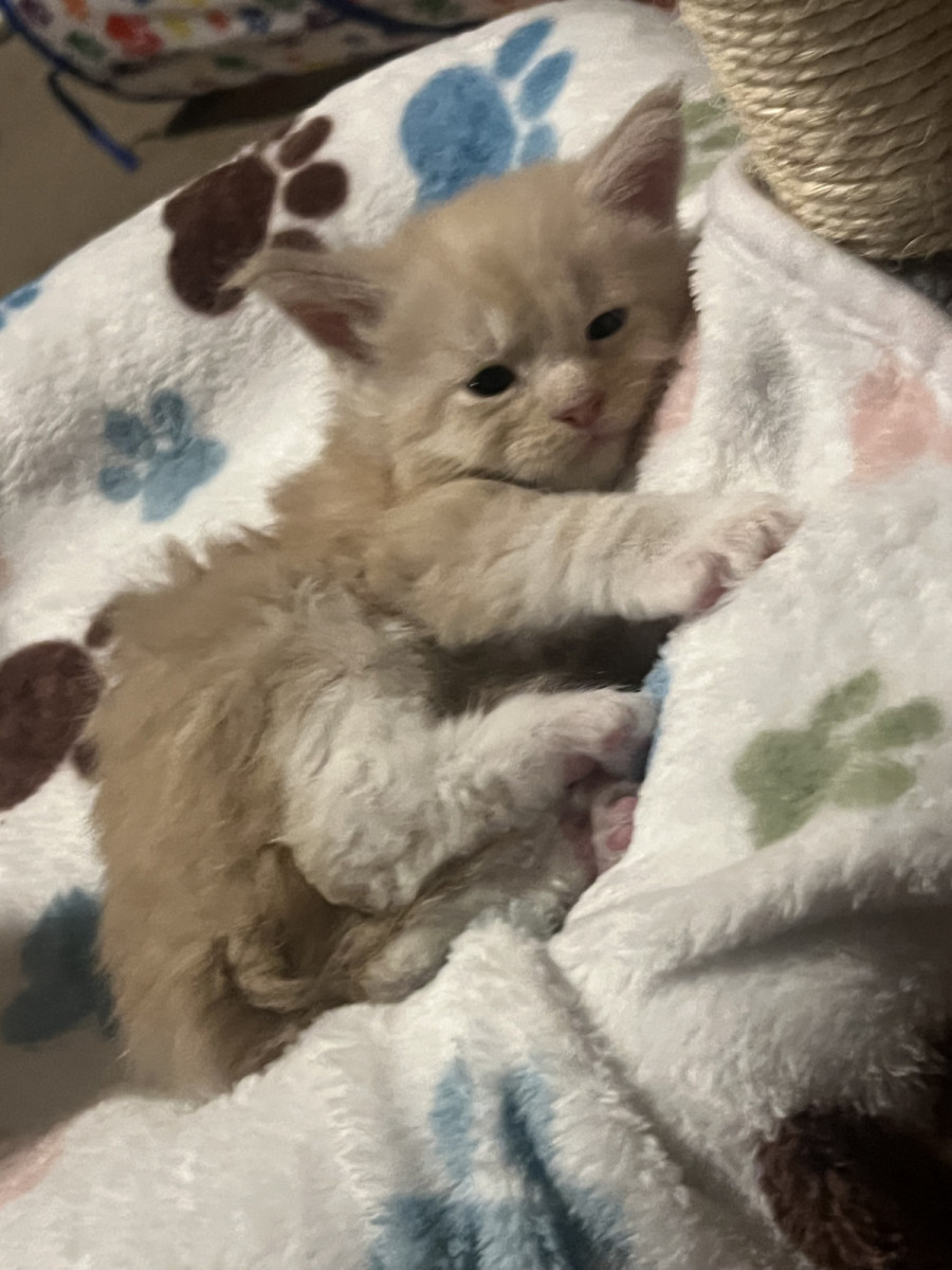 Zimba is a stunning 3-week-old Maine Coon kitten with a strong build and sweet temperament. He will be ready for his forever home after he is fully weaned and vet-checked.